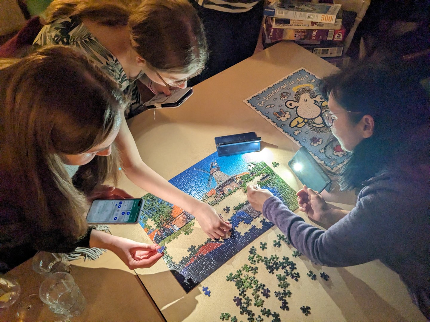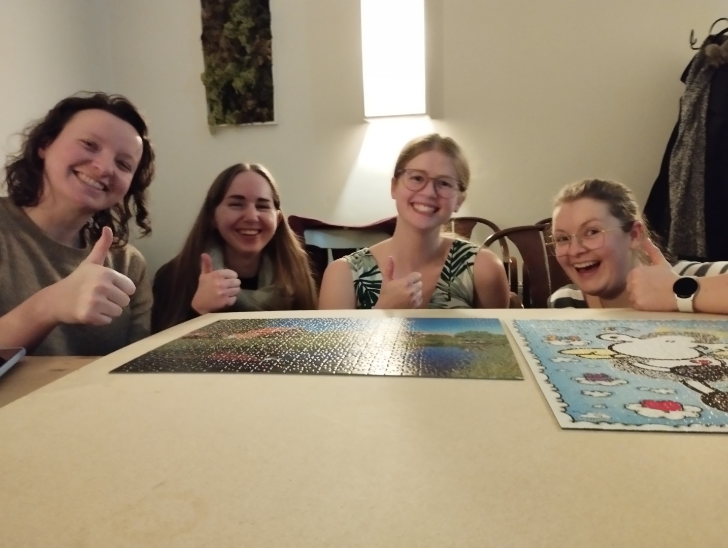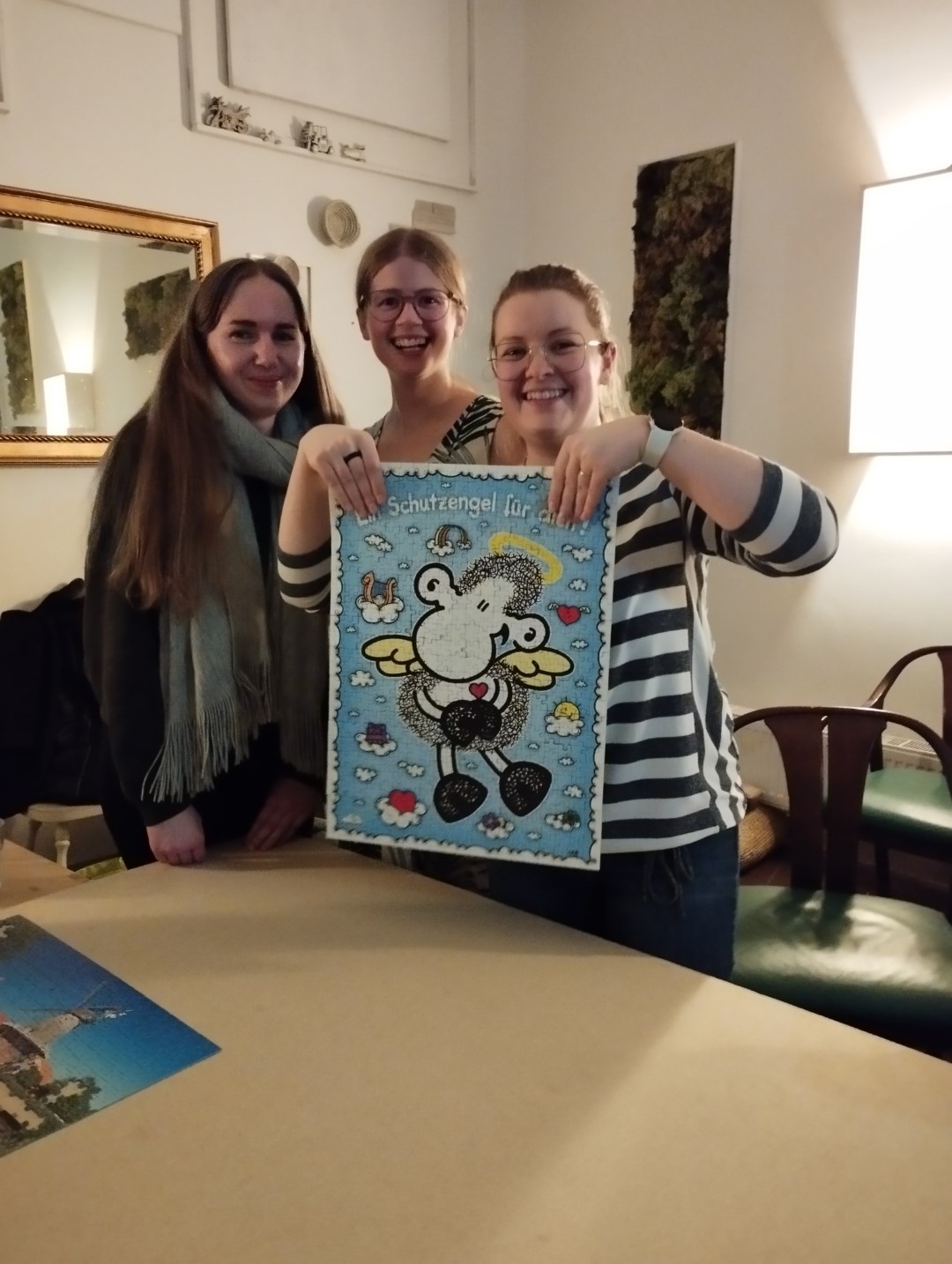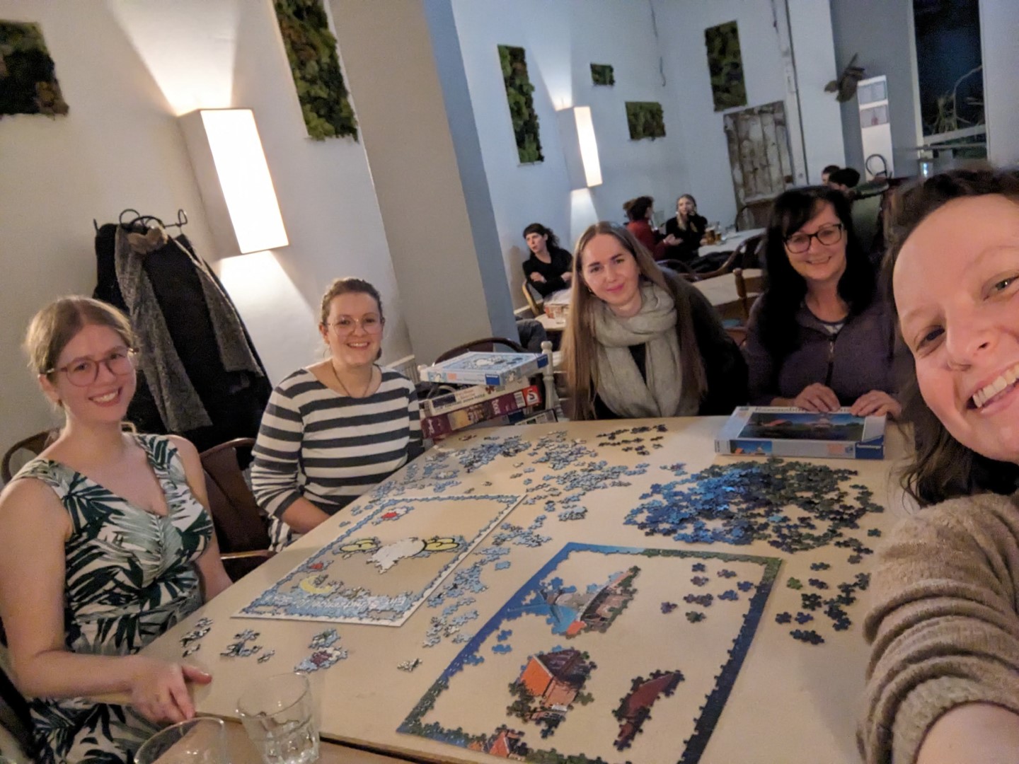 Unser Treffpunkt war das gemütliche Café Kork, wo uns der zuvorkommende Inhaber großzügig im oberen Geschoß Platz verschaffte, indem er eine geräumige Holzplatte für uns vorbereitete. Alle kamen mit großen Taschen voller Puzzles an und gingen schließlich mit neuen Funden nach Hause. Als Dankeschön für die Gastfreundschaft schenkten wir dem Café eines der gelegten Puzzles, das nun stolz in ihrem Stapel von Brettspielen thront.
